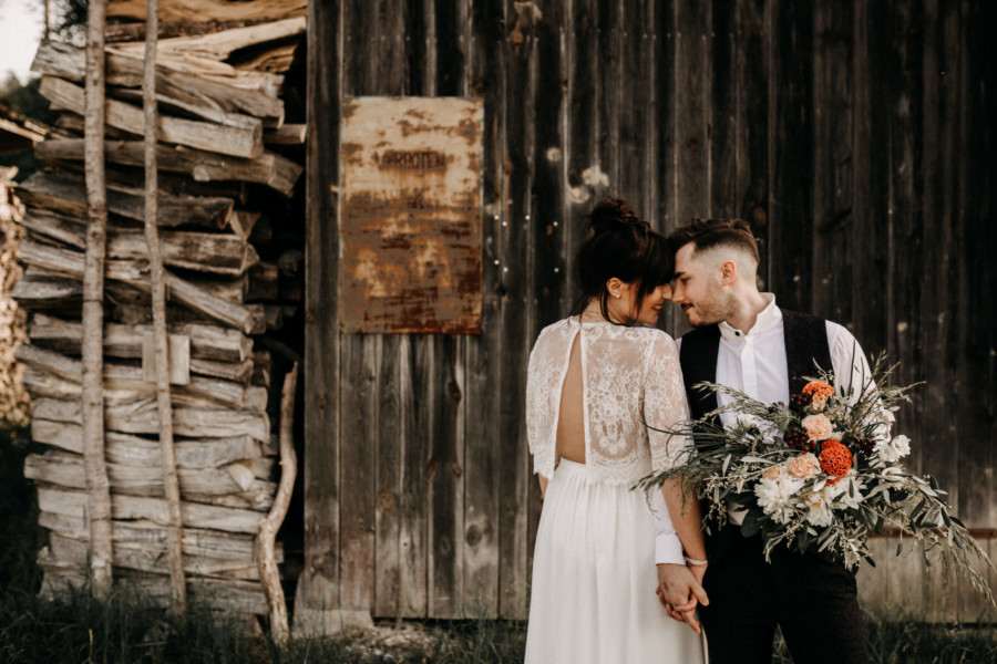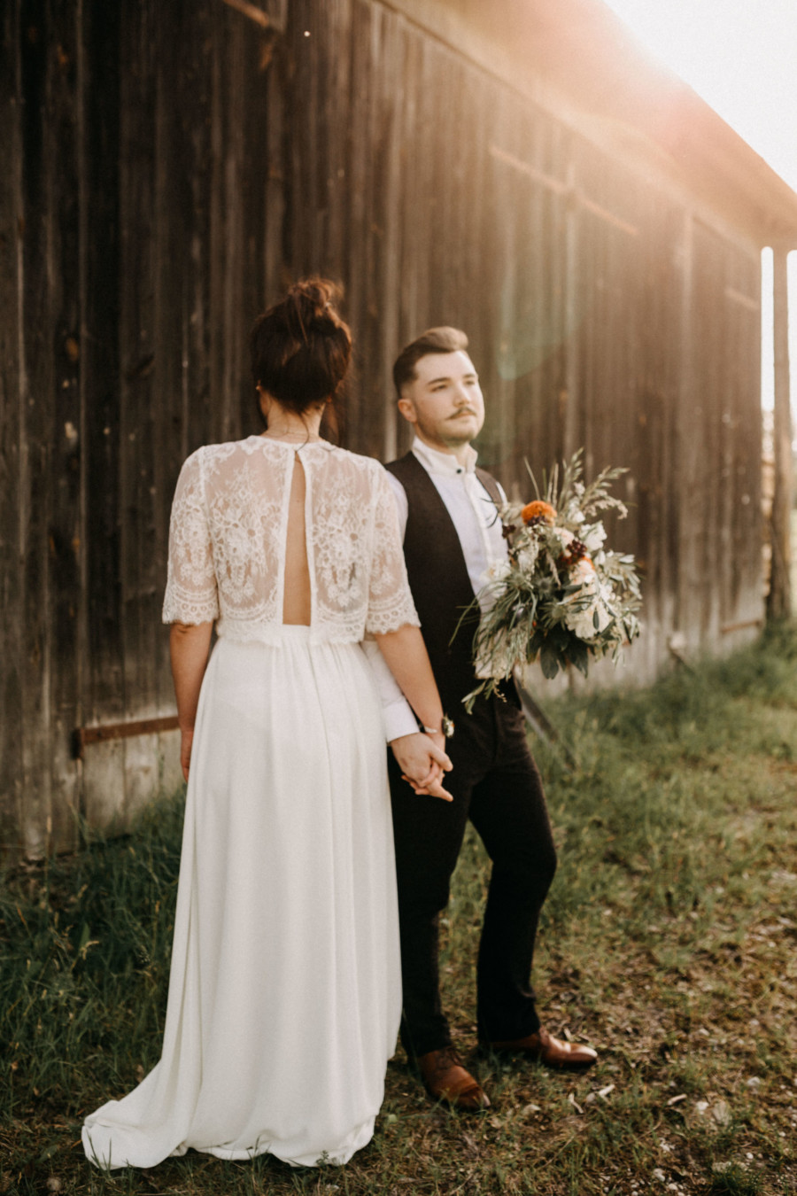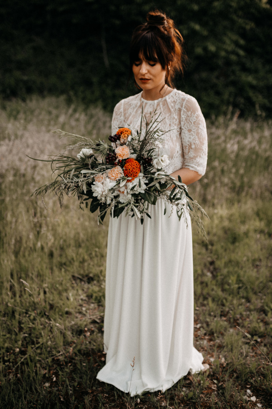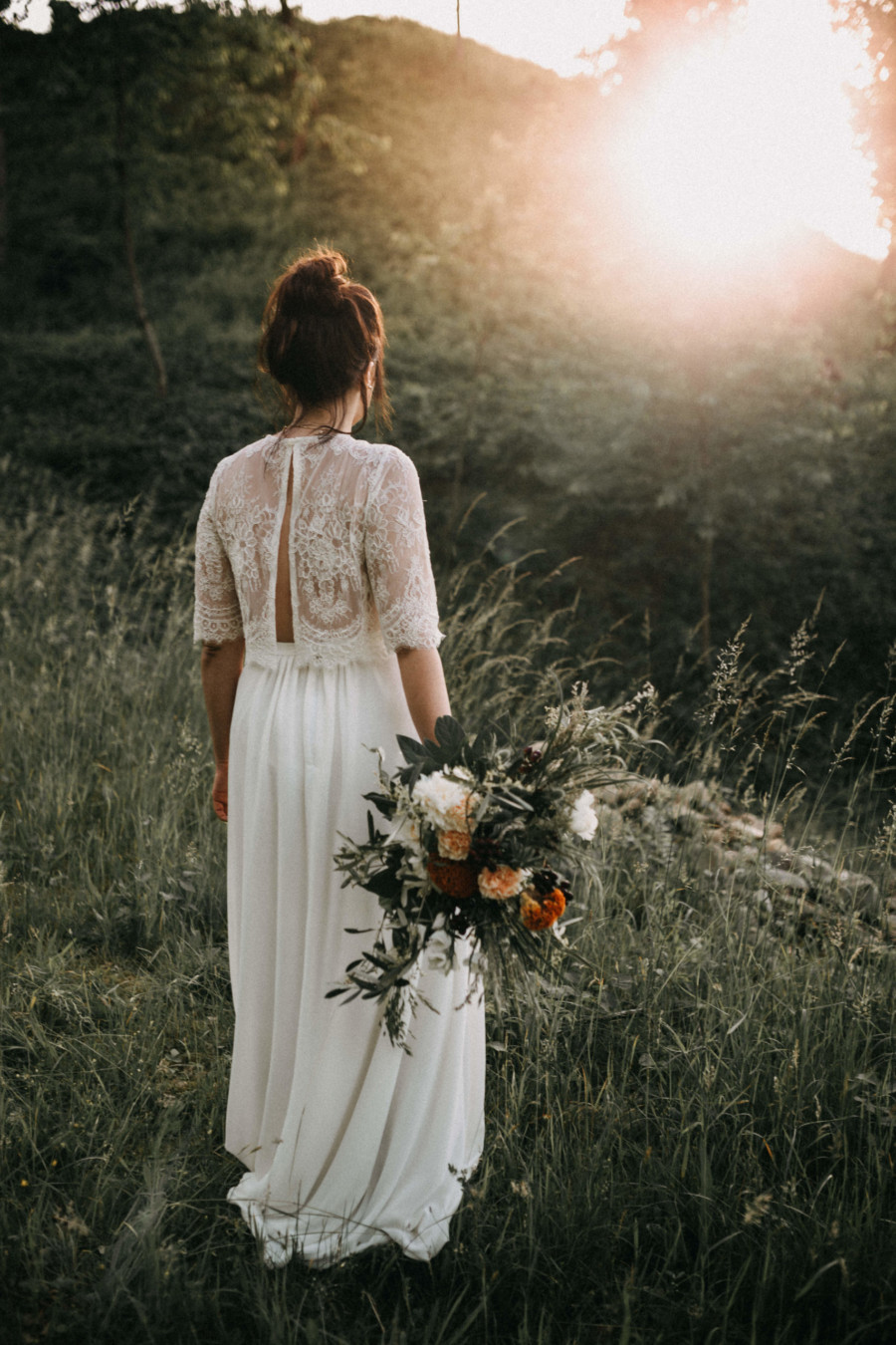 Ein Zweiteiler-Brautkleid bestehend aus einem zarten Spitzentop mit einem wunderschönen floralen Muster. Dieses Braut-Top lässt sich am Rücken schließen und besticht durch die Offenheit und die wundervolle Spitzenborte.