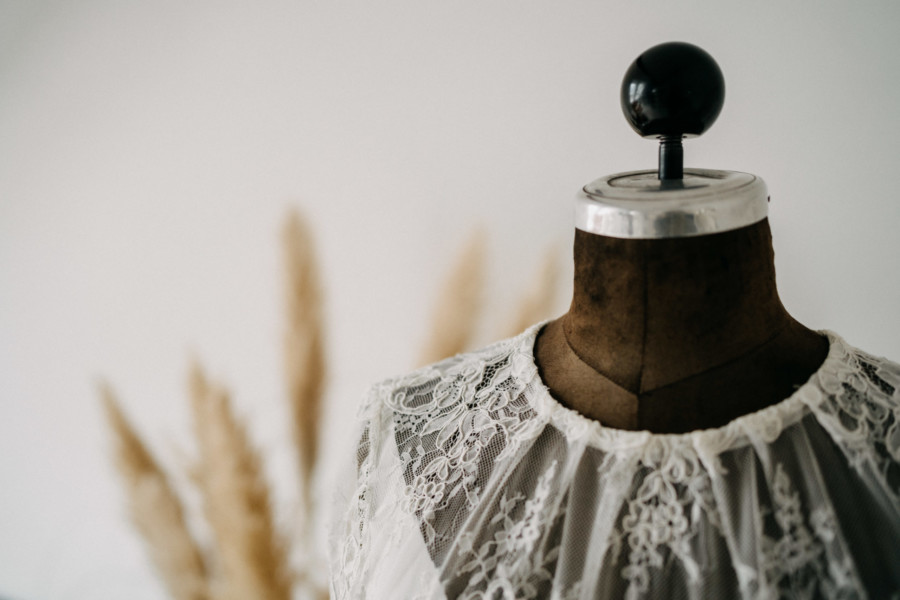 Antonia ist eine herzliche, fröhliche und unkomplizierte Persönlichkeit. Eine genaue Vorstellung ihres Brautkleides hatte sie erstmal nicht. Dafür wusste sie aber, dass sie nicht nur ein Kleid für einen Tag tragen möchte. Gemeinsam entschieden wir uns für einen Stoff aus Lyocell – auch Tencel genannt – welcher aus natürlichen Eukalyptusfasern besteht und in nachhaltiger Forstwirtschaft hergestellt wird. Die verspielt geometrische Spitze ist ebenfalls aus reiner GOTS zertifizierter Baumwolle. Das besondere an diesen Materialien ist nicht nur der ökologische Aspekt. Dieses Brautkleid kann problemlos nach Hochzeit eingefärbt und für viele weitere Anlässe mit Freude und liebevoller Erinnerung getragen werden.